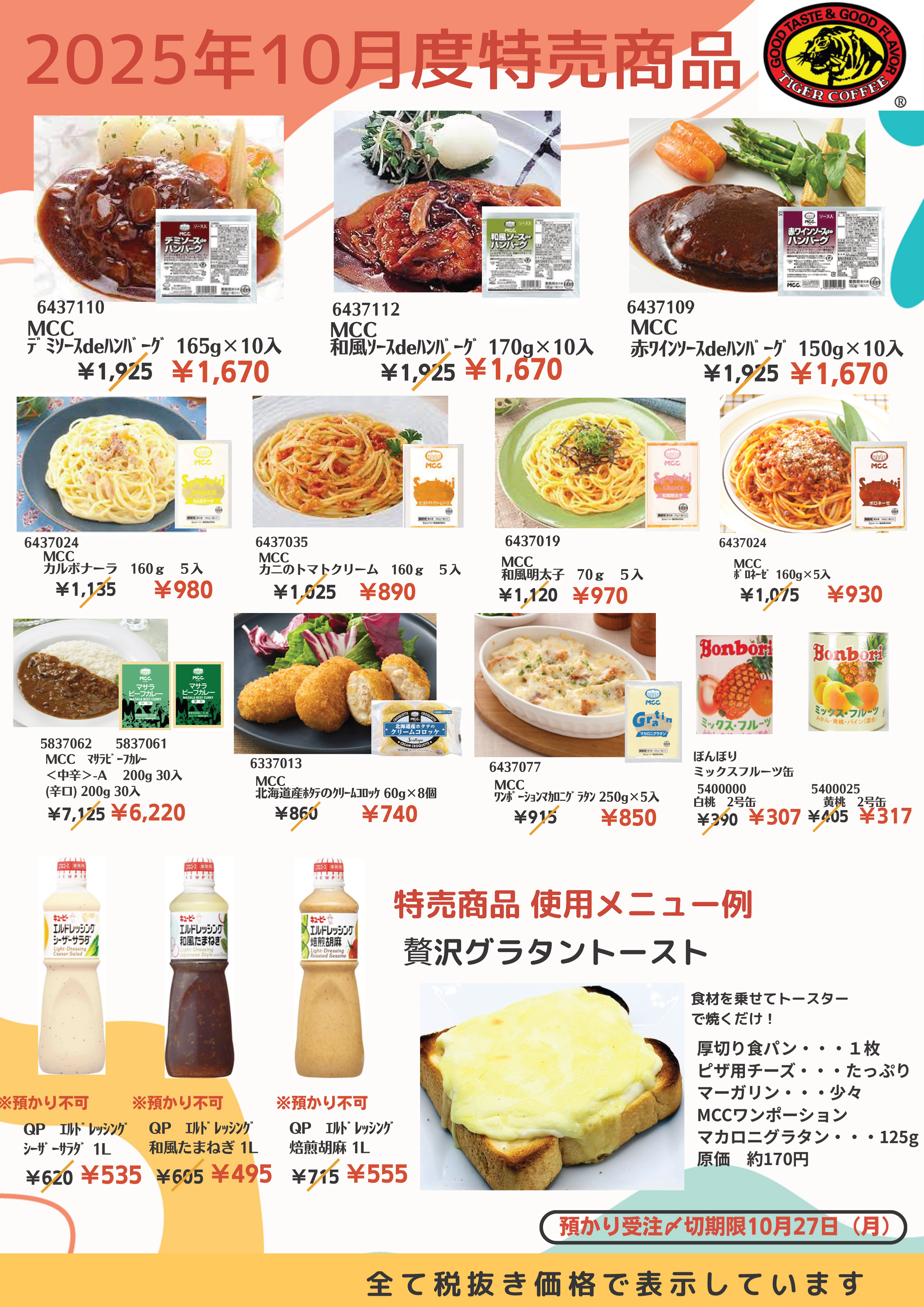 ハンバーグソース各種(デミソース・和風ソース・赤ワインソース)や、パスタソース(カルボナーラ・カニのトマトクリーム・和風明太子・ボロネーゼ)、マサラビーフカレーなど、秋の食卓にぴったりな商品をお得な価格でご提供いたします。