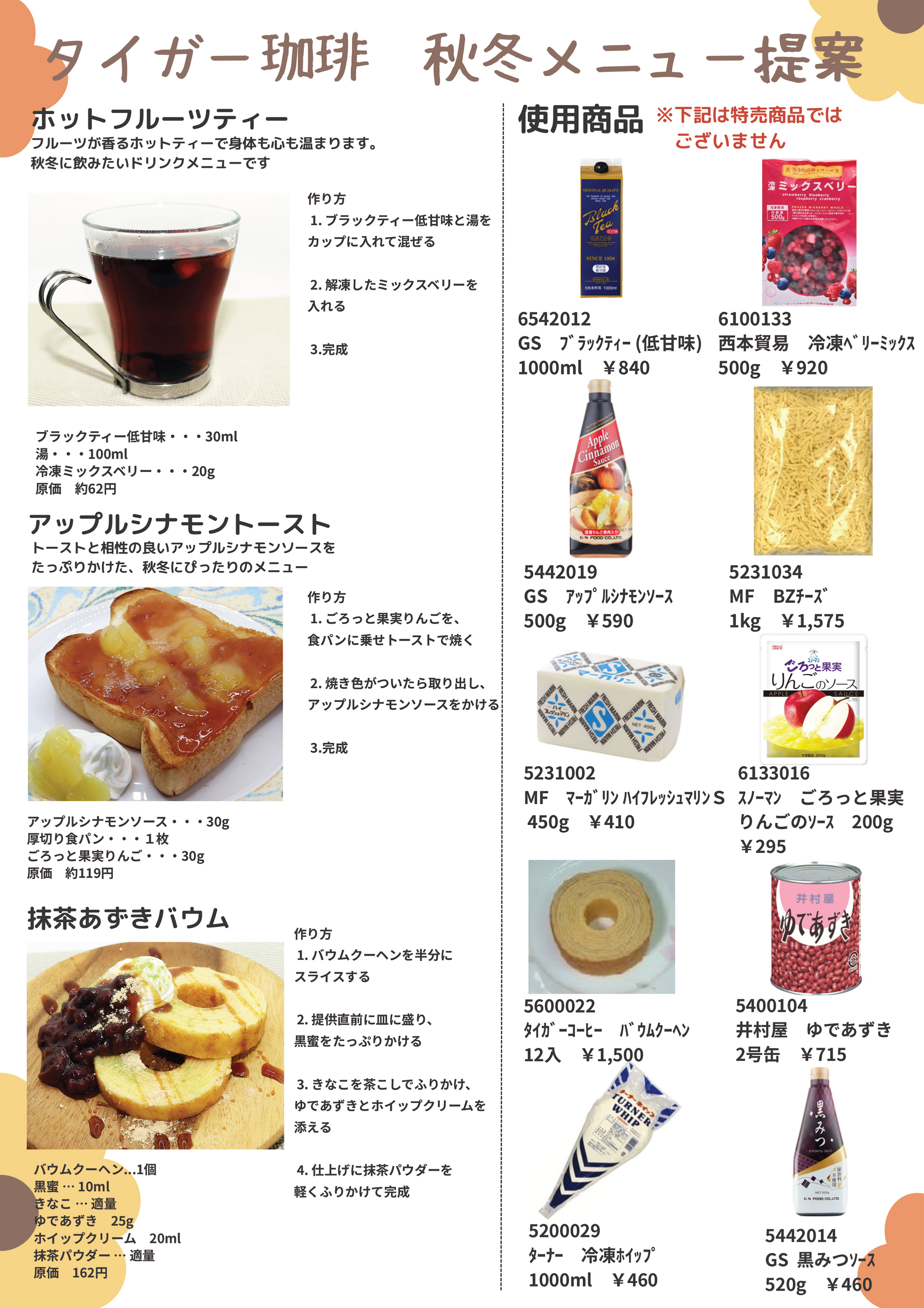 秋冬メニューとしてホットフルーツティーやアップルシナモントースト、抹茶あずきバウムなどの提案もございます。