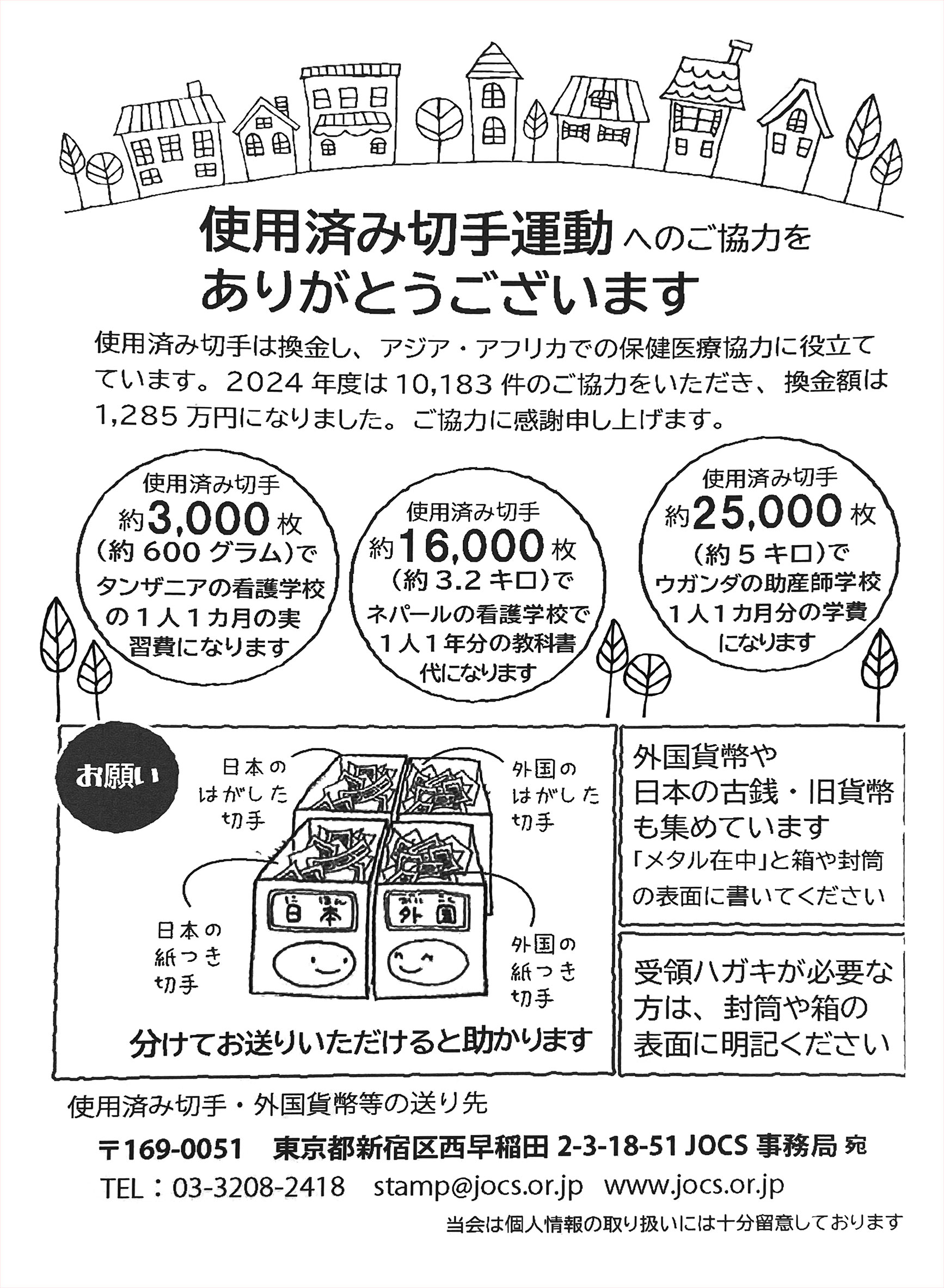お送りいただいた使用済み切手は、アジア・アフリカでの保健医療協力活動へと役立てられ、困難の中にある人々の健康といのちを守る支援につながっています。小さな取組ではありますが、引き続きSDGS活動を推進して参ります。