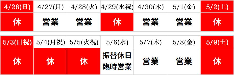 ゴールデンウィーク期間中の営業日及び休業日について、ご案内申し上げます。 休業期間は次のとおりです: ・4月29日 ・5月2日〜5月5日 ・5月6日(振替休日)は臨時営業日 尚、ゴールデンウィーク前後の納品日につきましては、担当の弊社営業よりご相談させて頂きます。 何卒よろしくお願い申し上げます。